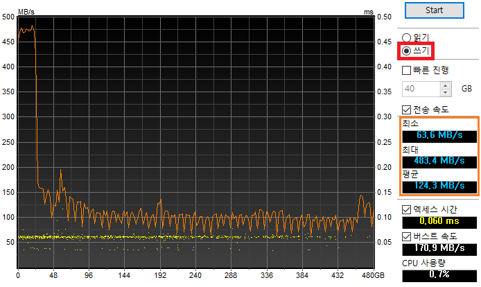 초반 SLC 캐시가 동작할 때는 470MB/s 정도의 속도를 보여 주다가 캐시 구간을 지나서 100MB/s 전후의 속도로 떨어지는 결과를 보여 줬습니다.