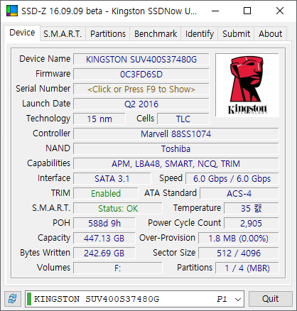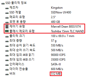 킹스톤 SSDNow UV400는 마벨 컨트롤러와 2D TLC 낸드를 사용한 SSD로 MLC와 3D TLC 낸드를 사용한 SSD보다는 성능이 부족하지만 발매 당시에 가성비로 사용할만했던 제품으로 기억합니다.