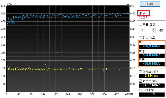 전 구간 평균 읽기 속도가 485.5MB/s로 측정되었습니다.