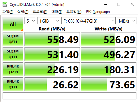 단일 순차 읽기 약 530MB/s, 단일 순차 쓰기 약 496MB/s로 측정되었습니다.