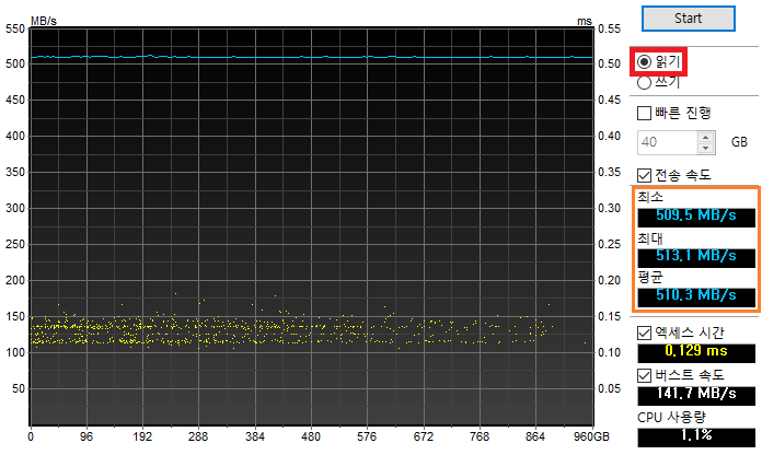 평균 속도 481MB/s에 평균 속도 50% 미만 구간 0.1%인 아주 좋은 결과를 보여 줬습니다.