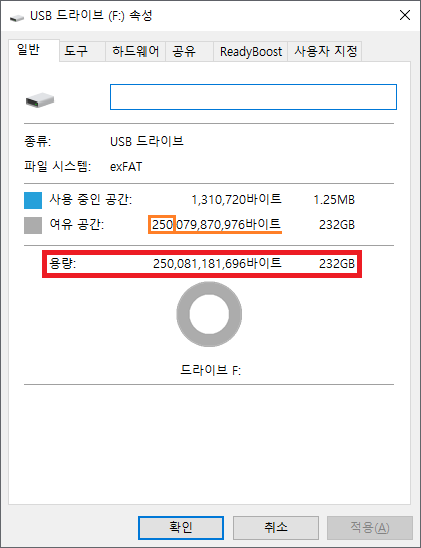 용량 표기 방법이 2진수와 10진수의 차이 때문에 조금 적게 표기된다 하여도 전체 용량은 256,000,000,000바이트는 되어야 하는데 250,000,000,000 바이트로 되어 있습니다.