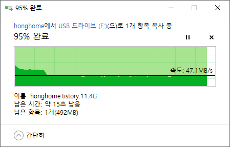 처음 복사 시작 후 속도가 떨어져서 74~78MB/s 정도의 속도를 한동안 유지하다가 다시 속도가 떨어져서 43~49MB/s의 속도를 유지한 상태로 복사가 끝났습니다.