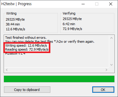 실제 읽기, 쓰기 속도를 확인해 보기 위해 H2testw 테스트를 해봤습니다.