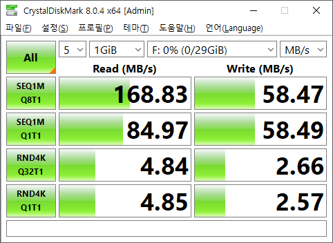 읽기 속도 약 168MB/s, 쓰기 속도 약 58MB/s로 측정되었습니다.