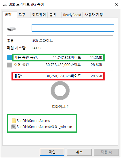 11.2MB가 사용 중인 용량으로 나오는데 SanDiskSecureAccess 프로그램이 들어 있어서 그렇습니다.