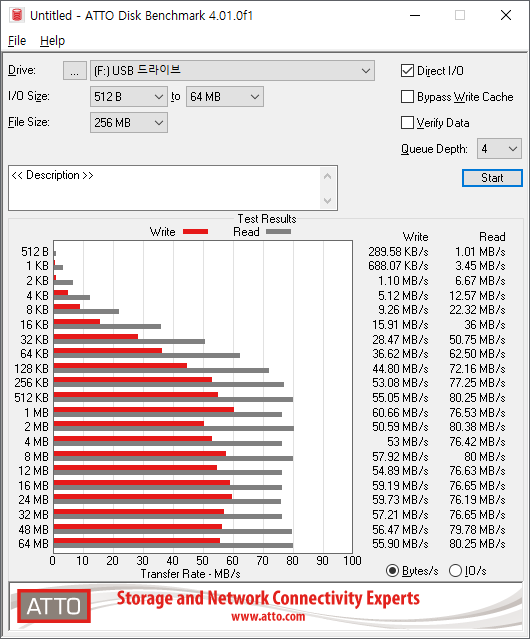 읽기 속도 약 76MB/s, 쓰기 속도 약 55MB/s로 측정되었습니다.
