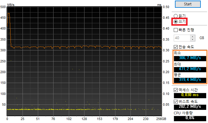 초반 캐시 구간을 지난 뒤 약 315MB/s 정도를 계속 유지하는 좋은 그래프를 보여줬습니다.