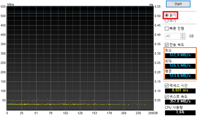 평균 읽기 속도가 513.8MB/s로 측정되었습니다.