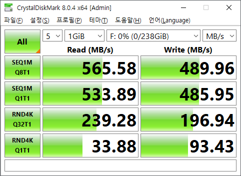단일 순차 읽기 약 530MB/s, 단일 순차 쓰기 약 485MB/s로 측정되었습니다.