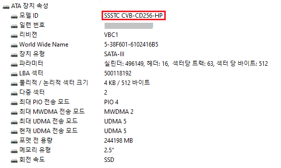 모델 ID가 'SSSTC CVB-CD256-HP'로 되어있습니다.