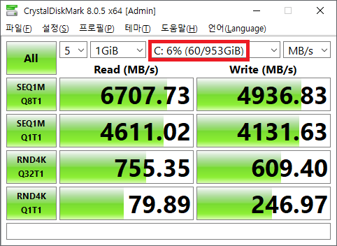 공식 사양인 읽기 7000MB/s, 쓰기 5000MB/s 이상의 속도가 나왔습니다.