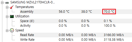 PCIe 4.0이 아닌 3.0 버전에서 테스트를 했기 때문에 최대 속도가 나오지 않아서 최대 성능을 발휘하면 조금 더 높은 온도가 기록될 것으로 생각됩니다.
