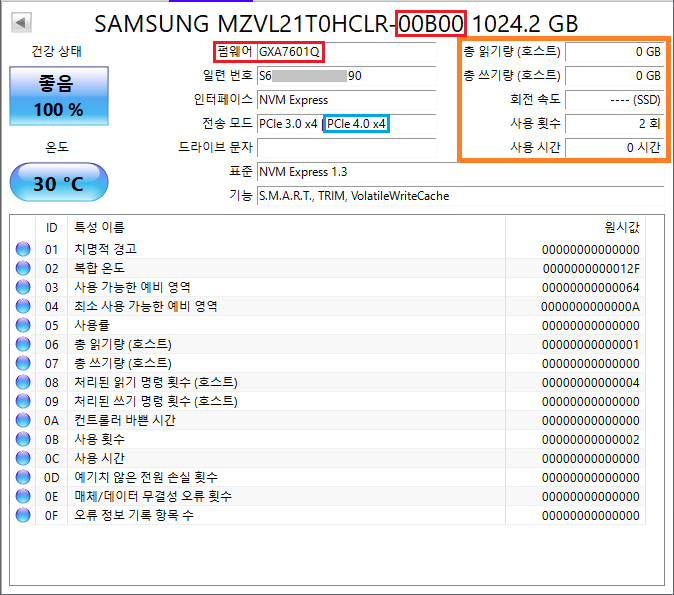 P/N은 MZVL21T0HCLR-00B00이고 펌웨어 버전은 GXA7610Q입니다.