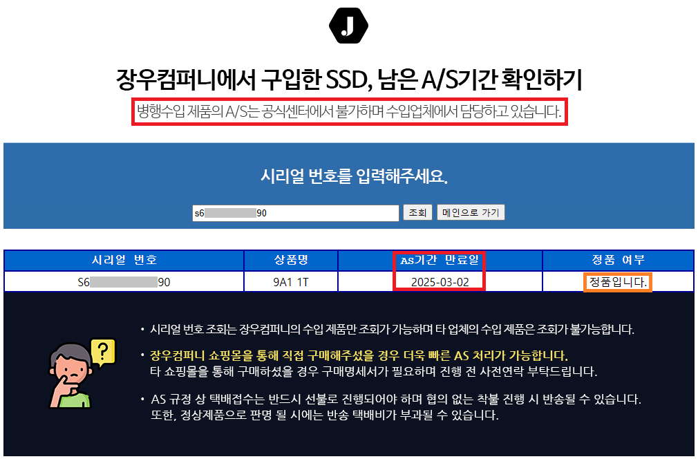 장우컴퍼니 유통 제품은 홈페이지에서 시리얼 조회로 AS 기간 만료일을 확인할 수 있습니다.