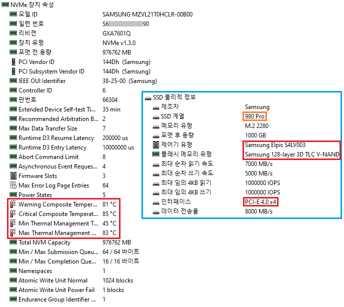 컨트롤러는 삼성 Elpis S4LV003, 낸드는 삼성 128층 3D TLC V낸드로 표기되어 있습니다.