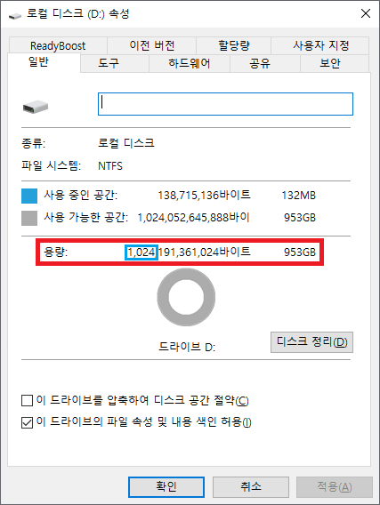 표기 용량은 1TB 지만 실제 사용 가능한 용량은 약 953GB입니다.