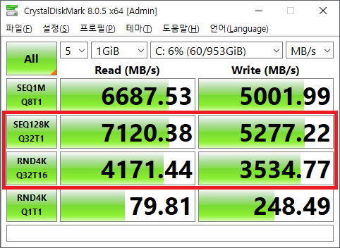 공식 사양인 읽기 7000MB/s, 쓰기 5000MB/s 이상의 속도가 나왔습니다.