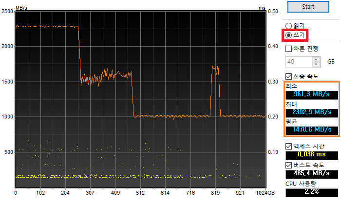 초기 속도는 약 2200MB/s의 속도를 유지하다가 중간에 1500MB/s로 한번 떨어진 후 다시 한번 더 떨어져서 1000MB/s의 속도를 유지했습니다.