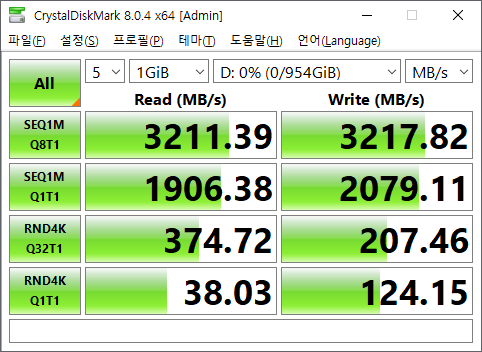 읽기 약 7100MB/s, 쓰기 약 5200MB/s의 결과과 나왔습니다